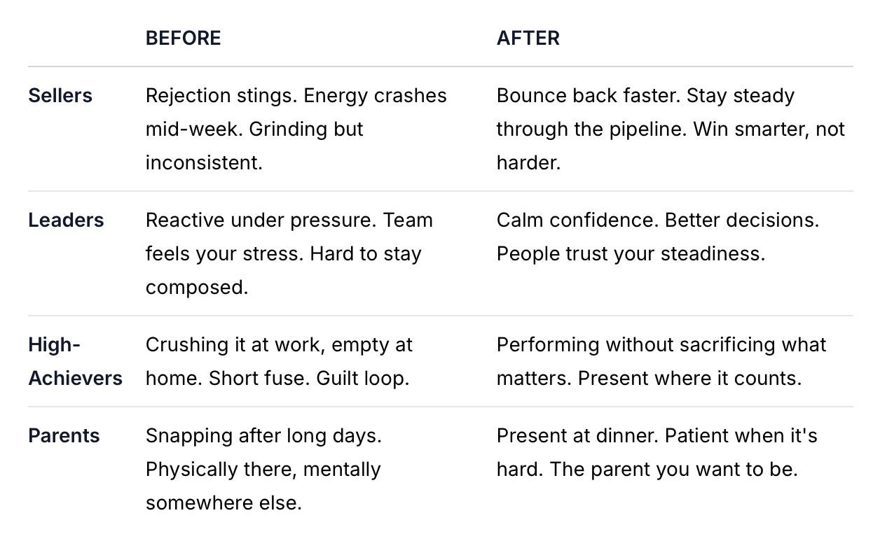 Consider what stress, reactivity, and burnout are already costing you. Lost deals. Strained relationships. Sleepless nights. This is an investment in the one thing that makes everything else work: how you show up.